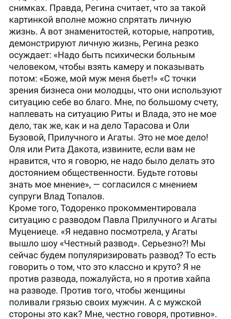 Не подумайте, что я за домашнее насилие, но.... Смотреть интервью, чтобы определиться, в каком контексте это было сказано, мне по правде лениво, но ту выдержку, которую я прочитала в статье, прям-таки такой крамольной совсем не считаю. Может, поняла неверно. Но в целом... Это раньше, да и сейчас еще наверняка в деревнях и поселках женщины с этим мирятся по нескольким достаточно объективным причинам. Во-первых, намного более сильны всё равно патриархальные устои жизни. Они даже не во внешних проявлениях, а в мозгах людей. Во-вторых, чисто физически в деревне женщине прожить одной, без мужика намного сложнее. В-третьих, уровень образованности достаточно невысок, причем это касается и сельской интеллигенции и в том числе и с высшим образованием.